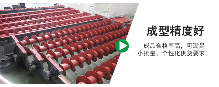 4、 與連軋技術(shù)相比,成型精度好,成品合格率高,可滿足小批量、個性化供貨要求,特別適用于大規(guī)格,大厚度及耐磨鋼、不銹鋼材料的螺旋葉片生產(chǎn)。