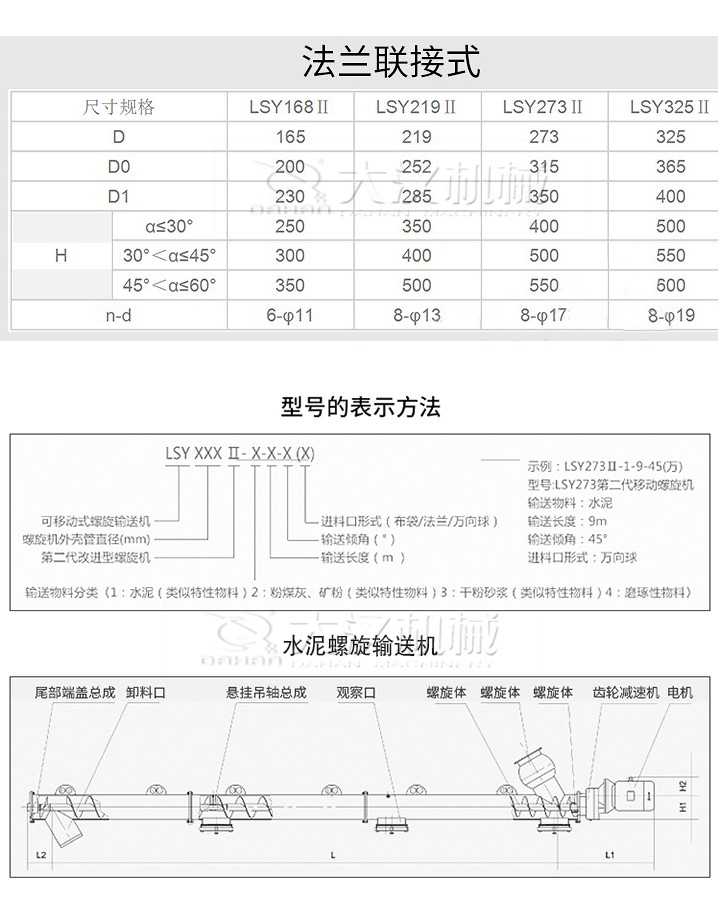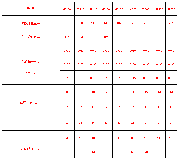 管式螺旋輸送機(jī)適用于水平或傾斜輸送粉狀、粒狀和小塊狀物料,如煤、灰、渣、水泥、糧食等,物料溫度小于200℃,不適宜輸送易變質(zhì)的、黏性大的、易結(jié)塊的物料。參數(shù)如下: