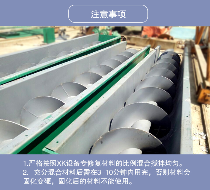 1.嚴(yán)格按照XK設(shè)備專修復(fù)材料的比例混合攪拌均勻。攪拌不均勻會(huì)出現(xiàn)局部不耐磨情況。