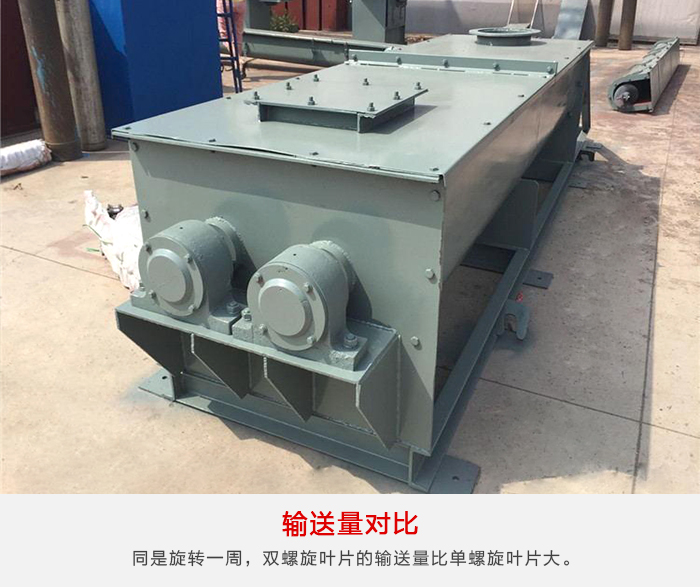 雙螺旋和單螺旋在同樣轉(zhuǎn)速下,因為雙螺旋葉片的螺旋角比單螺旋葉片高,因此雙螺旋葉片的輸送流量比單螺旋葉片大,同是旋轉(zhuǎn)一周,雙螺旋葉片的輸送量比單螺旋葉片大。