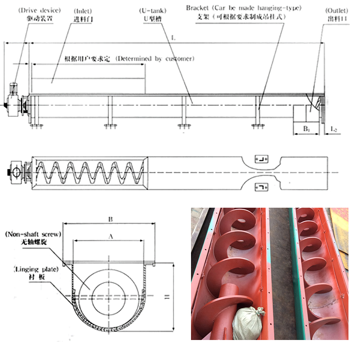 無軸螺旋絞龍輸送機(jī)由無軸螺旋、U型槽、襯板、蓋板、進(jìn)出口和驅(qū)動(dòng)裝置組成。