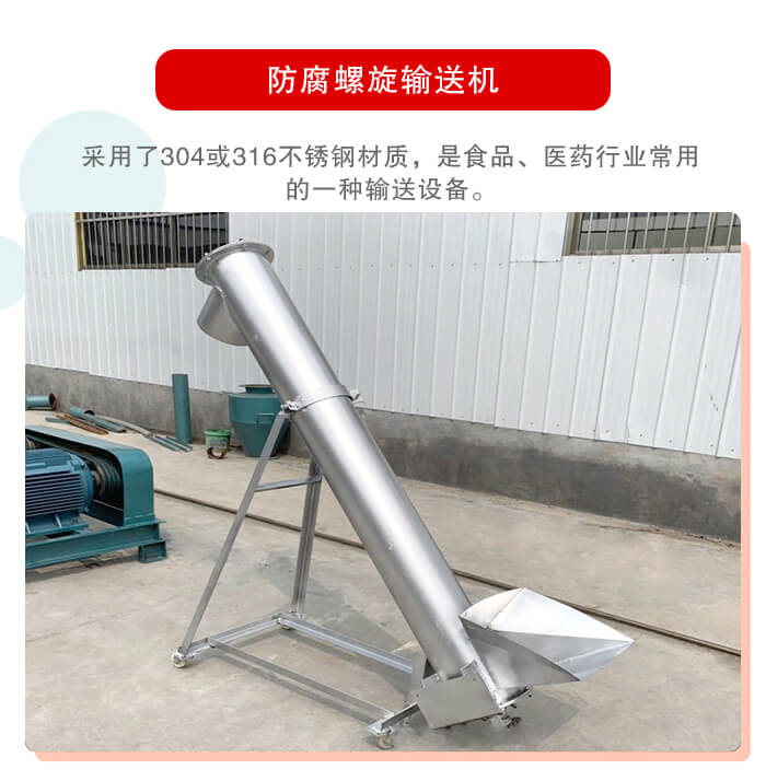 防腐螺旋輸送機(jī)采用了304或316不銹鋼材質(zhì),是食品、醫(yī)藥行業(yè)常用的一種輸送設(shè)備,今天小編就來(lái)為大家介紹一下防腐螺旋輸送機(jī)的特點(diǎn)及適用范圍: