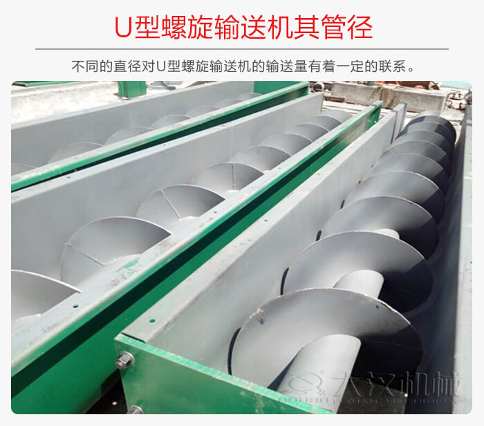 U型螺旋輸送機的管徑,大致有:150,200,250,--600毫米不等,其不同的直徑對U型螺旋輸送機的輸送量有著一定的關系,所以大家在選擇時要盡量考慮到這幾點。
