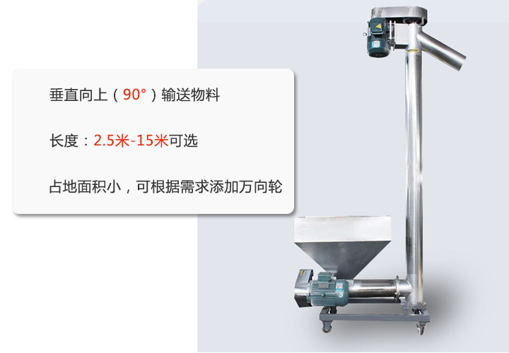 垂直螺旋輸送機(jī)用于解決需要垂直向上(90°)輸送物料的難題,其長度2.5米-15米,大家可根據(jù)需要選擇長度;相比普通螺旋輸送機(jī),該款設(shè)計(jì)更好的節(jié)約了占地面積,也可根據(jù)場地需要添加移動輪,方便來回移動。