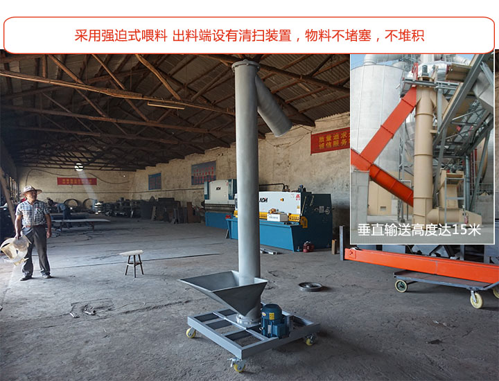 大漢垂直立式螺旋輸送機采用的是強迫式喂料,在出料端安裝有清掃裝置,輸送中物料不堵塞,不堆積;采用垂直(90°)或大傾角輸送,節(jié)省占地面積,垂直輸送高度可達15米,可根據(jù)需求選擇。