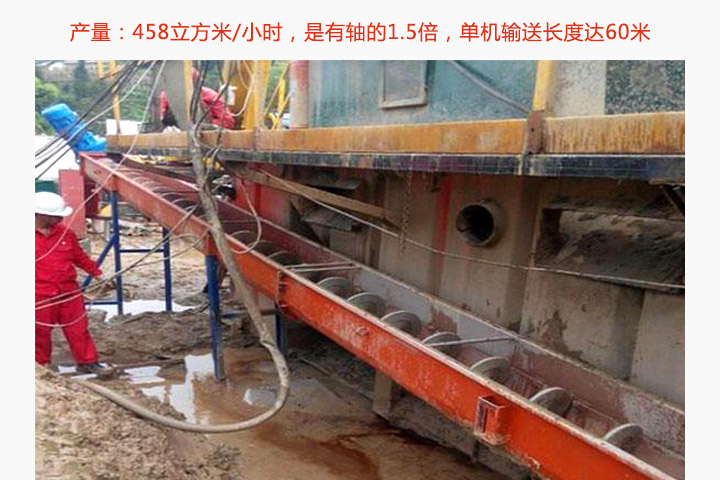 輸送量大,距離長:無軸螺旋輸送機(jī)產(chǎn)量達(dá)458立方米/小時,是有軸的1.5倍,扭矩可達(dá)4000N.m,單機(jī)輸送長度達(dá)60米。