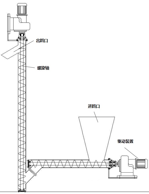 物料隨螺旋高速旋轉(zhuǎn),被輸送的物料從水平部分的進(jìn)料口加入,通過(guò)旋轉(zhuǎn)的水平進(jìn)料螺旋送入輸送機(jī)和垂直部分,然后將物料向上推至出料口出料口由垂直螺旋,物料隨螺桿高速旋轉(zhuǎn),被輸送的物料從水平部分的進(jìn)料口加入,通過(guò)旋轉(zhuǎn)的水平進(jìn)料螺旋進(jìn)入輸送機(jī)。和垂直部分,然后用垂直螺旋將物料推到出料口排出。