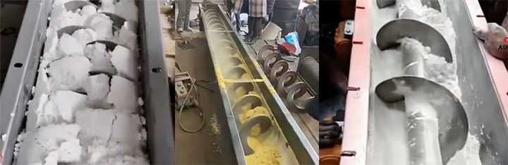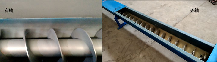 U型無(wú)軸螺旋輸送機(jī)沒(méi)有中心軸的設(shè)計(jì),螺旋葉片厚度在3mm以上,強(qiáng)度高,耐磨性好,適合有輕微吸潮、易結(jié)塊,易粘附的含濕堿粉輸送,可以徹底解決濕堿粉在軸上“抱軸”堆積和堵塞機(jī)器的問(wèn)題,但是其成本比有軸貴1000-5000元不等。