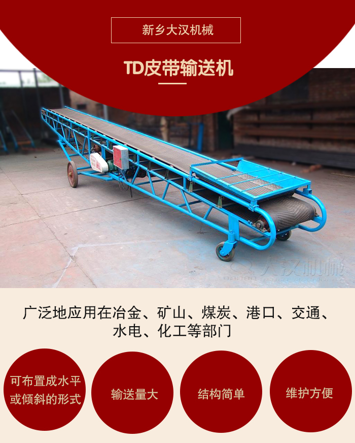 DTⅡ、TD75型皮帶由于輸送量大,結(jié)構(gòu)簡單,維護(hù)方便,成本低,通用性強(qiáng)等優(yōu)點,而被廣泛地應(yīng)用在冶金、礦山、煤炭、港口、交通、水電、化工等部門,進(jìn)行裝車、裝船、轉(zhuǎn)載或堆積各種常溫狀態(tài)的松散密度為500~2500kg/m3各種散狀物料或成件物品。由單機(jī)或多機(jī)組合成運(yùn)輸系統(tǒng)來輸送物料,根據(jù)工藝要求可布置成水平或傾斜的形式,DTⅡ型皮帶輸送機(jī)除了可滿足水平或傾斜輸送要求外,還可采用帶凸弧段、凹弧段與直線段組合的輸送形式。輸送機(jī)允許輸送的物料塊度取決于帶寬、帶速、槽角和傾角,也取決于大塊物料出現(xiàn)的頻率。該輸送機(jī)適用的工作環(huán)境溫度一般為-25~+40℃。我公司還生產(chǎn)輕型皮帶輸送機(jī)和移動式輸送機(jī)。