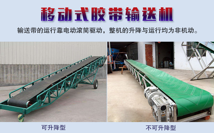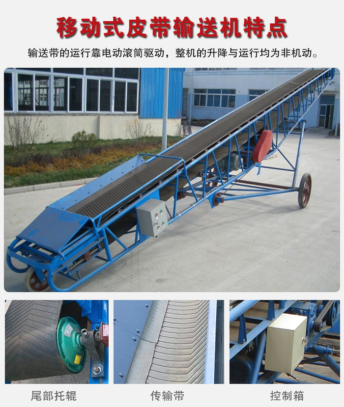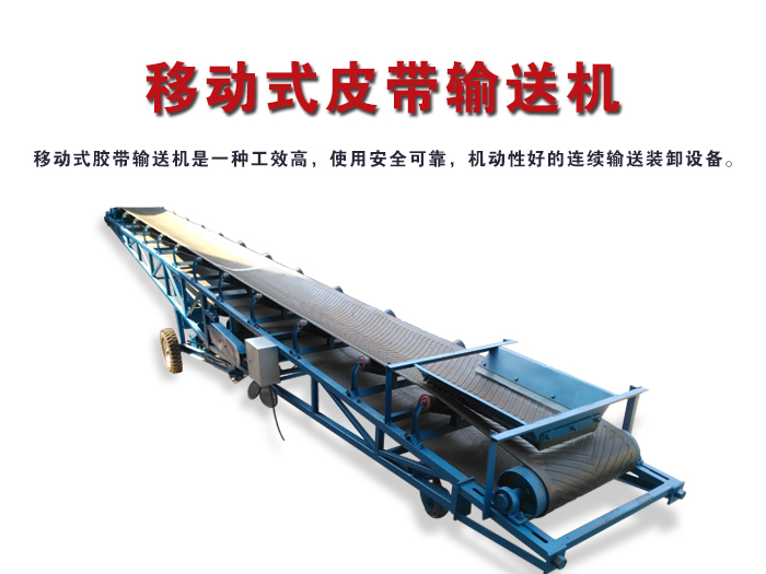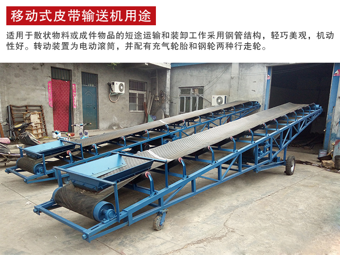 移動式皮帶輸送機(jī)適用于散狀物料或成件物品的短途運(yùn)輸和裝卸工作。采用鋼管結(jié)構(gòu),輕巧美觀,機(jī)動性好。轉(zhuǎn)動裝置為電動滾筒,并配有充氣輪胎和鋼輪兩種行走輪。機(jī)長10米以上且傾角可以調(diào)整。