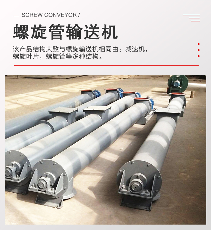 螺旋管輸送機(jī)就是螺旋輸送機(jī),準(zhǔn)確的說(shuō)是管式螺旋輸送機(jī)。該設(shè)備整體由圓管構(gòu)成,所以很多人稱(chēng)之為螺旋管輸送機(jī)。該產(chǎn)品結(jié)構(gòu)大致與螺旋輸送機(jī)相同由:減速機(jī),螺旋葉片,螺旋管等多種結(jié)構(gòu)。