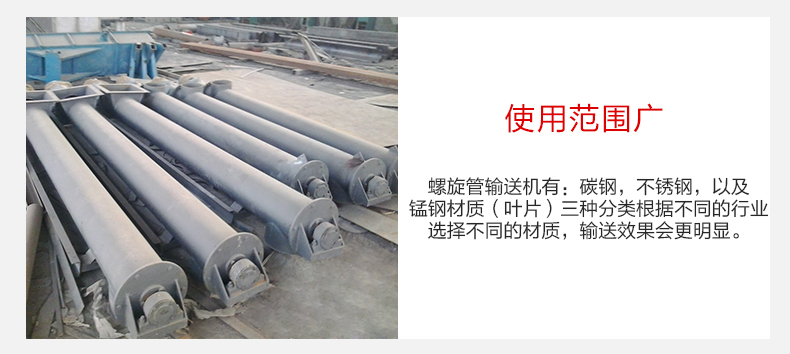 3,產(chǎn)品材質(zhì)可供多個(gè)行業(yè)進(jìn)行選擇,螺旋管輸送機(jī)有:碳鋼,不銹鋼,以及錳鋼材質(zhì)(葉片)三種分類(lèi)根據(jù)不同的行業(yè)選擇不同的材質(zhì),輸送效果會(huì)更明顯。