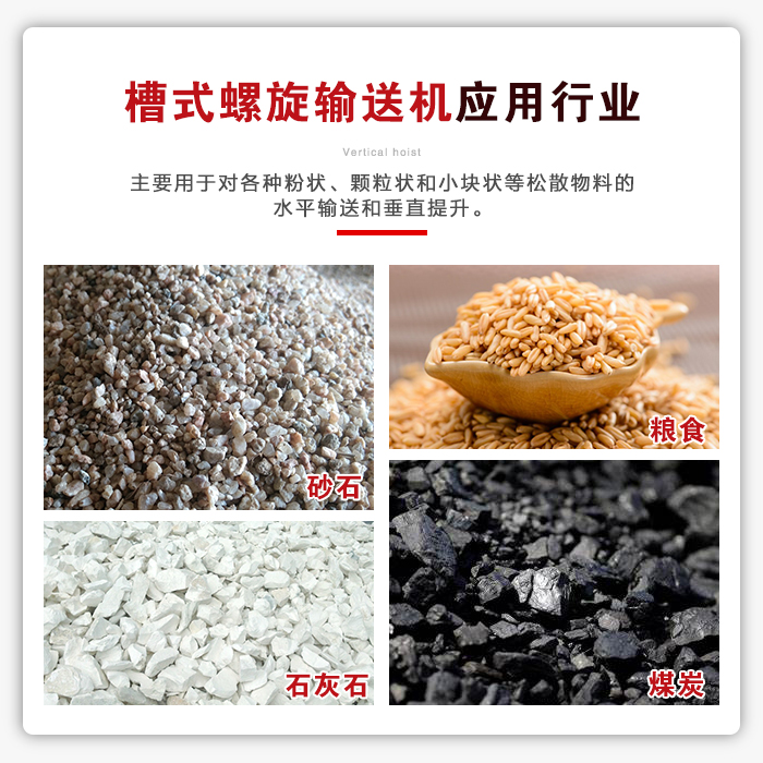 槽式螺旋輸送機(jī)是農(nóng)業(yè)各部門]機(jī)械化運(yùn)輸工作的主要機(jī)組,可使運(yùn)輸工作減輕勞動(dòng)強(qiáng)度,提高工作效率,應(yīng)用范圍很廣。槽式螺旋輸送機(jī)適用于各行業(yè),如建材、化工、電力、冶金、煤炭、糧食等行業(yè),適用于水平或傾斜輸送粉狀、粒狀和小塊狀物料,如煤、灰、渣、水泥、糧食等。