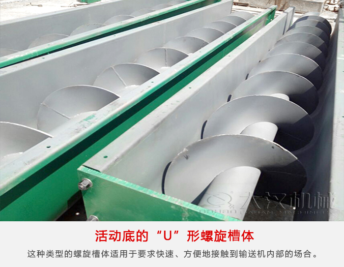 這種類型的螺旋槽體適用于要求快速、方便地接觸到輸送機(jī)內(nèi)部的場合。活動底的U形螺旋槽體由上部剛性的槽鋼與下部半圓形截面槽上體所構(gòu)成,半圓形截面槽體的一邊為鉸接面,另一邊則采用彈簧卡子夾緊或其他形式能快速打開的連接裝置。