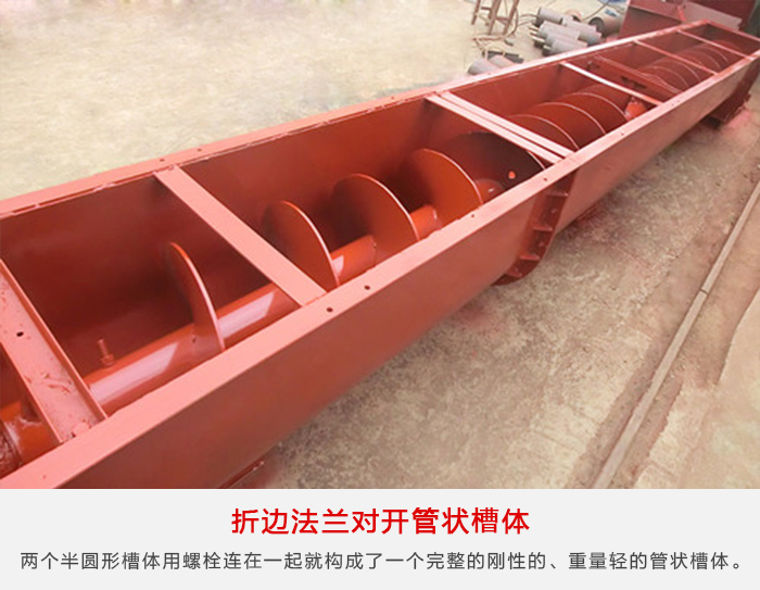 煤粉螺旋輸送機(jī)這種形式的槽體類似于角鐵法蘭槽體,但法蘭是由半圓形槽體的同一塊鋼板橋邊加工制成,兩個(gè)半圓形槽體用螺栓連在一起就構(gòu)成了一個(gè)完整的剛性的、重量輕的管狀槽體。