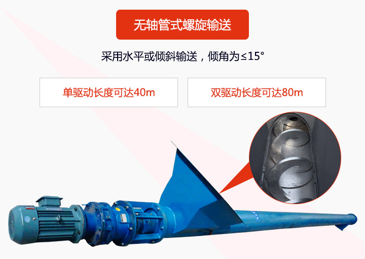 無(wú)軸?管式螺旋輸送機(jī)也叫管式無(wú)軸螺旋輸送機(jī),其外形為圓管式,可水平或傾斜輸送,其傾角為≤15°,有雙驅(qū)動(dòng)和單驅(qū)動(dòng)之分,單驅(qū)動(dòng)螺旋機(jī)長(zhǎng)度可達(dá)40m,雙驅(qū)動(dòng)螺旋機(jī)采用中間斷開(kāi)軸結(jié)構(gòu),長(zhǎng)度可達(dá)80m。由于采用了無(wú)軸設(shè)計(jì),可輸送粘性強(qiáng)、易纏繞的物料,物料不易堵塞,排料口不堵塞。