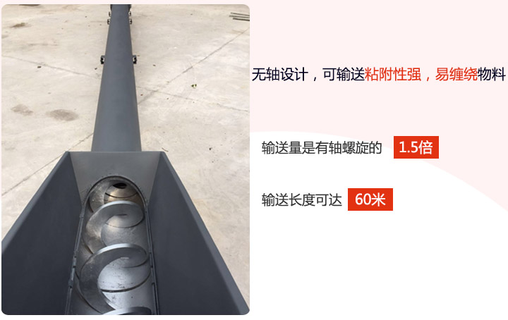 2、輸送量是相同直徑傳統(tǒng)有軸螺旋輸送機(jī)的1.5倍,單機(jī)輸送長(zhǎng)度可達(dá)60米。