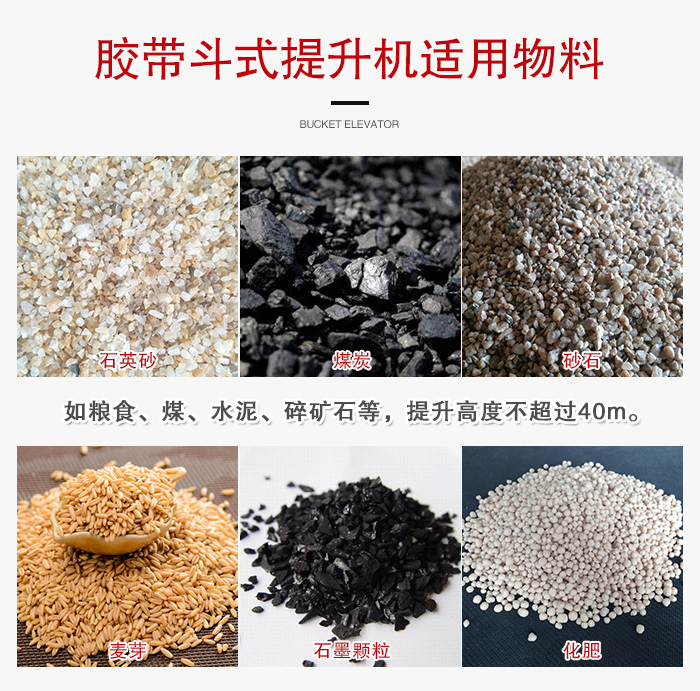 膠帶斗式提升機(jī)由運(yùn)行部分(料斗與牽引膠帶),帶有傳動滾筒的上部區(qū)段,帶有拉緊滾筒的下部區(qū)段,中間機(jī)殼,驅(qū)動裝置,逆止制動裝置等組成,適用于向上輸送松散密度ρ<1.5t/m3粉狀、粒狀和小塊狀的無磨琢性和半磨琢性散狀物料,如煤、砂、焦末、水泥、碎礦石等。
