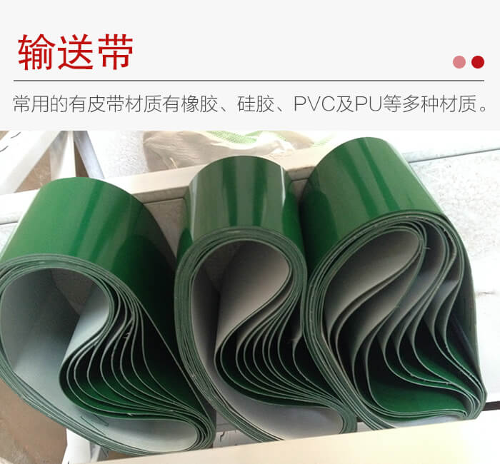 在皮帶輸送機(jī)上常用的有皮帶材質(zhì)有橡膠、硅膠、PVC及PU等多種材質(zhì)。橡膠帶適用于工作環(huán)境溫度-15至40℃之間。物料溫度在50℃以下,50℃以上的要求在訂貨時(shí)需告知廠家,可以選用耐高溫輸送帶。向上輸送散粒料的傾角12°至24°。對于大傾角輸送可用裙邊帶。